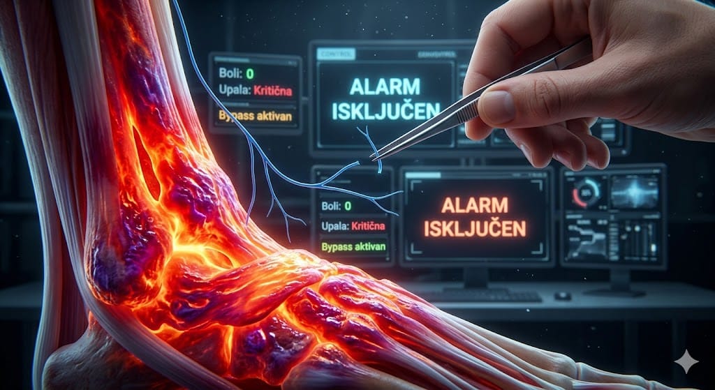 Svi smo prošli kroz to. „Popij nešto, stisni zube i izdrži tih 90 minuta.“ U sportskom svijetu, to se smatra vrlinom, dokazom karaktera. U biokemijskom svijetu, to je sabotaža prve kategorije. Zamislite svoje tijelo kao visokonaponsko postrojenje. Bol je osigurač. On iskače s razlogom – da bi spriječio požar u cijelom sustavu. Svaki put kad popijete tabletu protiv bolova (bilo koji nesteroidni antireumatik) i odete na trening, Vi niste „pobijedili“ ozljedu. Vi ste samo izvadili osigurač i premostili struju žicom. Tableta protiv bolova ne liječi tkivo, ona samo prekida komunikaciju između vaših nociceptora i mozga. To je kao da na kontrolnoj ploči aviona, dok motor gori, prerežete žicu koja pali crvenu lampicu. Lampica se ugasi, vi se nasmiješite i nastavite letjeti. Ali motor i dalje gori.