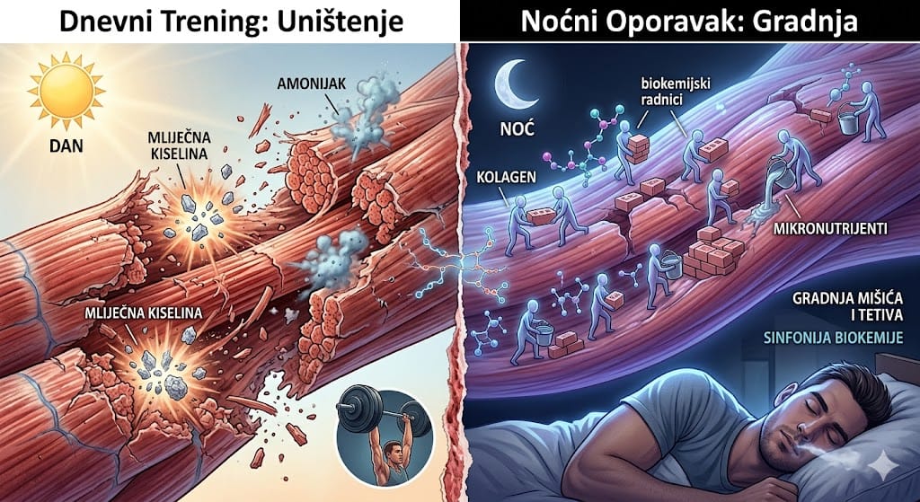 Mišić i tetiva se ne grade pod utegom. Oni se grade isključivo u onih 20 sati dok mirujete. Taj prozor je vaša jedina prilika za anaboličku restauraciju. Ako u tom periodu nema specifičnog „građevinskog materijala“ – one biokemijske potpore o kojoj naši osviješteni čitatelji sada detaljno uče na portalu – vaš sustav ostaje u ruševinama.