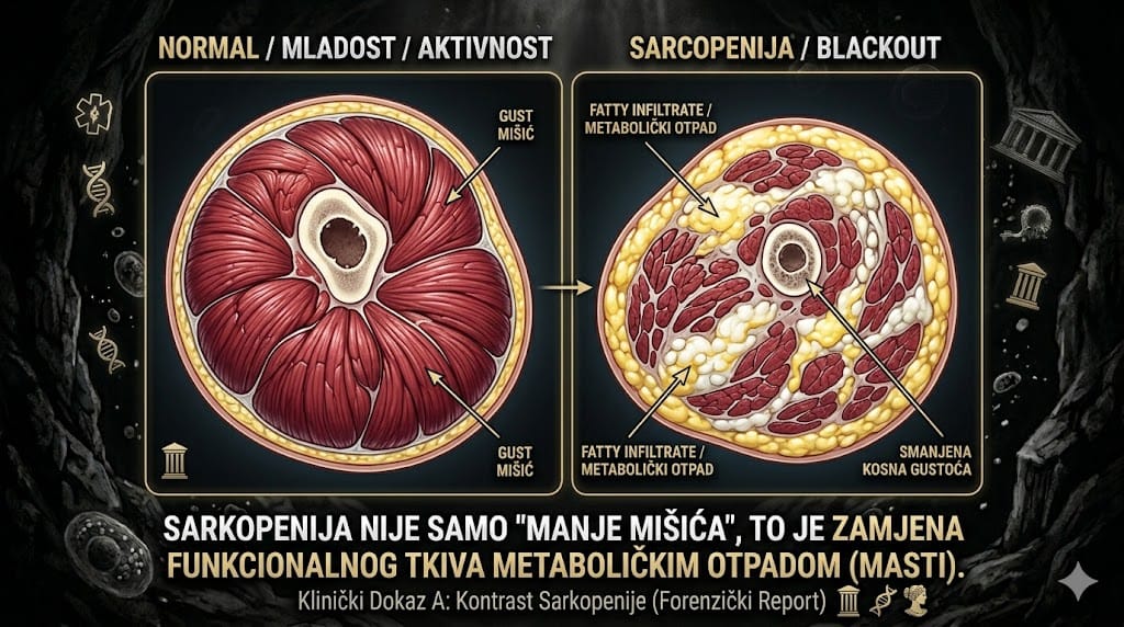 U ovom biokemijskom trileru nećemo pričati bajke o "zlatnim godinama". Secirat ćemo sarkopeniju – progresivni gubitak mišićne mase koji, poput biološkog kanibala, proždire vašu snagu, vašu metaboličku slobodu i, na koncu, vašu koštanu srž.